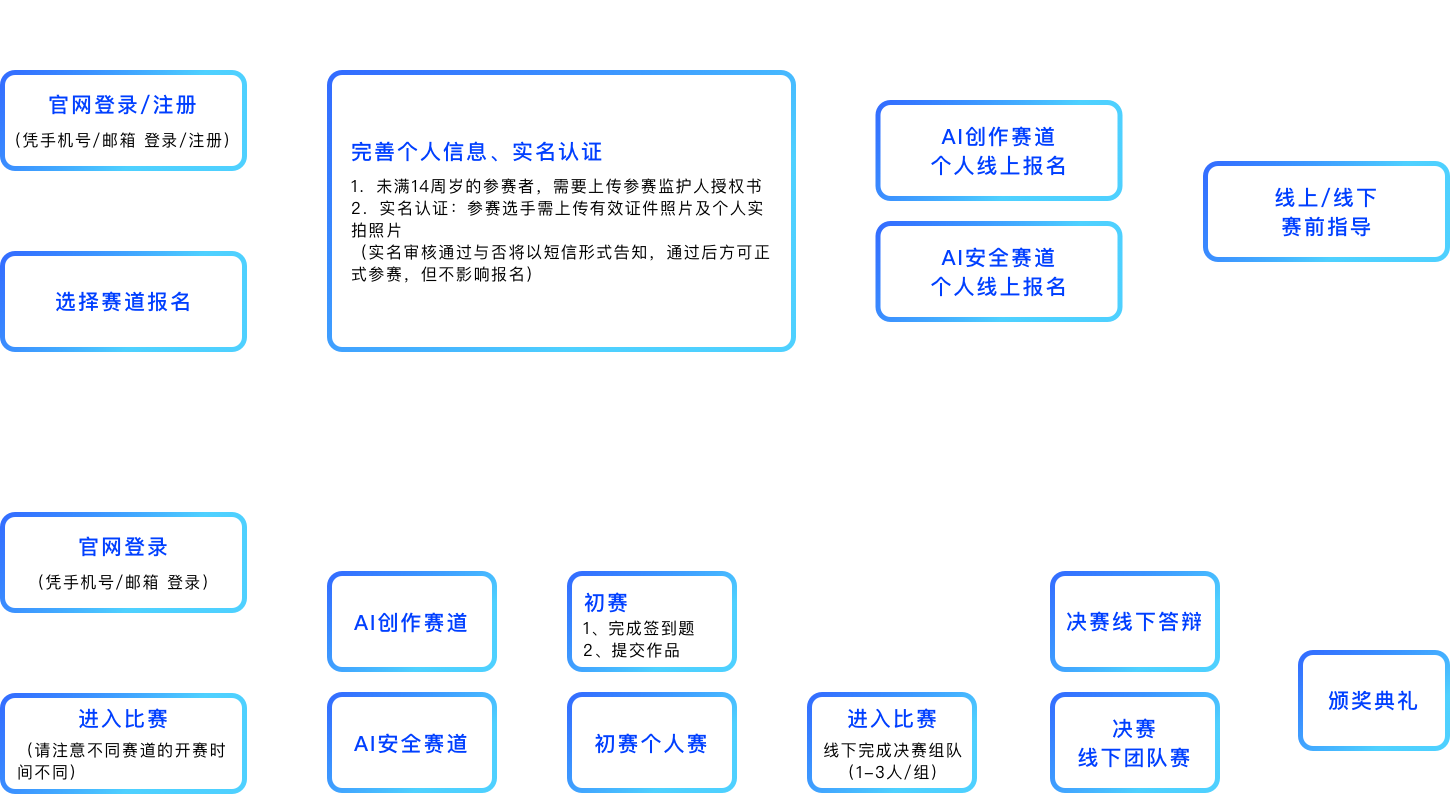 3.”AI创作赛道”及“AI安全赛道”均设决赛,决赛需选手现场答辩/线下参赛,根据最终得分情况评奖。
